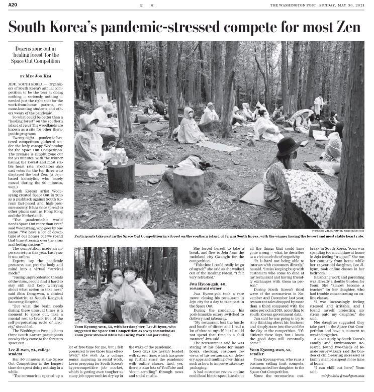 ÀÌ ½Å¹®Àº Áö³ 5¿ù 30ÀÏ A20¸é¿¡¡ºÇѱ¹¿¡¼ ÆÒµ¥¹Í ½ºÆ®·¹½º ÁöÄ£ À̵éÀÌ ±Ã±ØÀÇ ÈÞ½ÄÀ» À§ÇØ °æÀïÇÏ´Ù(South Korea¡¯s pandemic-stressed compete for most Zen)¡»¶ó´Â Á¦¸ñÀ¸·Î ±â»ç¸¦ °ÔÀçÇÏ¿´´Ù.