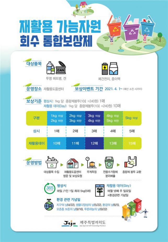 ÀçȰ¿ëµ¥ÀÌ¿¡´Â ÀçȰ¿ëµµ¿ò¼¾ÅÍ·Î °¡Áö°í ¿À´Â ÀçȰ¿ë °¡´ÉÀÚ¿ø(Åõ¸í ÆäÆ®º´, ĵ, Æó°ÇÀüÁö, Á¾ÀÌÆÑ) 1kg´ç Á¾·®Á¦ºÀÅõ(10§¤) 10¸Å¸¦ º¸»óÇØ ÁÖ´Â À̺¥Æ®¸¦ ÁøÇàÇϸç, 2kgºÎÅÍ´Â 1kg´ç 1¸Å¸¦ Ãß°¡ÇÏ¿© ÀçȰ¿ë µµ¿ò¼¾ÅÍ¿¡¼ ±Ù¹«ÀÚ°¡ Á÷Á¢ Áö±ÞÇÑ´Ù.