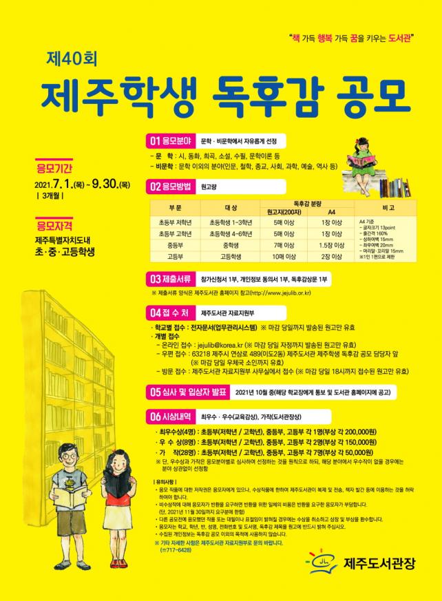 ÀÀ¸ð±â°£Àº 7¿ù 1ÀϺÎÅÍ 9¿ù 30ÀϱîÁöÀ̰í, ¿øÇÏ´Â µµ¼¸¦ ÀÚÀ¯·Ó°Ô °ñ¶ó ÀÐÀº ÈÄ ¹®ÇФýºñ¹®ÇÐ ºÎ¹®À» ±¸ºÐÇÏ¿© ÀÀ¸ðÇÏ¸é µÈ´Ù. Á¢¼ö´Â ÀüÀÚ¹®¼(¾÷¹«°ü¸®½Ã½ºÅÛ)¸¦ ÅëÇÑ Çб³º° Á¢¼ö, Á÷Á¢ ¹æ¹®, ¿ìÆí(63218 Á¦Áֽà ¿¬»ï·Î 489) ¹× ÀüÀÚ¸ÞÀÏ(jejulib@korea.kr)À» ÅëÇØ °¡´ÉÇÏ´Ù.