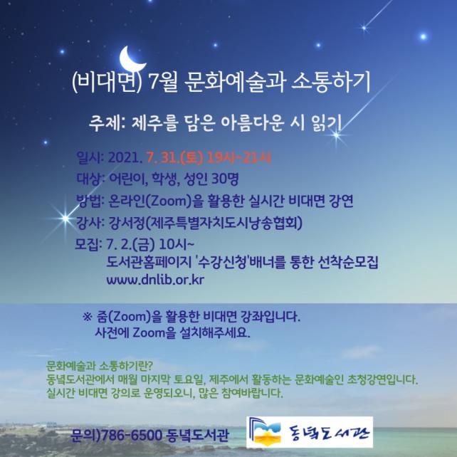 À̹ø ¡®¹®È¿¹¼ú°ú ¼ÒÅëÇϱ⡯¿¡¼´Â °¼Á¤(Á¦Áֽó¶¼ÛÇùȸ, ½Ã³¶¼Û°¡)°»çÀÇ ÁøÇàÀ¸·Î Á¦ÁÖ¿Í °ü·ÃµÈ ½Ã¸¦ ÇÔ²² Àаí ÇØ¼®Çغ¸´Â ½Ã°£À» °®°Ô µÇ¸ç, ¿î¿µÀº ¿Â¶óÀÎ(Zoom)À» Ȱ¿ëÇÑ ½Ç½Ã°£ ºñ´ë¸é °ÀÇ·Î 7¿ù 31ÀÏ(Åä) 19½Ã¿¡ ¿î¿µÇÑ´Ù.