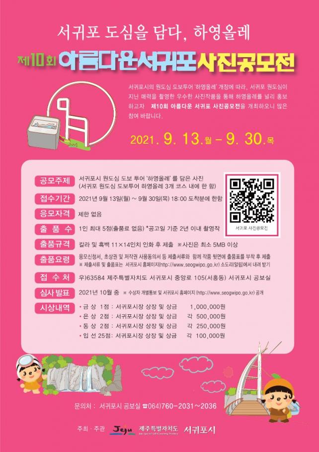 µû¶ó¼ ÇÏ¿µ¿Ã·¹ 3°³ ÄÚ½º ³»¿¡¼ ÃÔ¿µµÈ »çÁø¿¡ ÇÑÇÏ¿© Á¢¼ö¸¦ ¹Þ´Âµ¥ Á¢¼ö´Â 9¿ù 13ÀϺÎÅÍ 9¿ù 30ÀϱîÁö ¹Þ´Â´Ù. ¶ÇÇÑ °ø°íÀÏ ±âÁØ 2³â À̳» ÃÔ¿µÇÑ ¹Ì ¹ßÇ¥ÀÛÀ̾î¾ß Çϸç Ãâǰ¼ö´Â 1Àδç ÃÖ´ë 5ÀÛǰ±îÁö·Î ´©±¸³ª Âü¿©°¡´ÉÇϸç Ãâǰ·á´Â ¾ø´Ù. Ãâǰ±Ô°ÝÀº 11¡¿14ÀÎÄ¡ ÀÎÈ»çÁøÀ¸·Î Ãâǰǥ¸¦ µÞ¸é¿¡ ºÎÂøÇÏ¿© Á¦Ãâ¼·ù¿Í ÇÔ²² ¹æ¹® ¶Ç´Â µî±â Á¢¼öÇÏ¸é µÈ´Ù. ´õ ÀÚ¼¼ÇÑ »çÇ×Àº ¼±ÍÆ÷½Ã ȨÆäÀÌÁö(http://www.seogwipo.go.kr)¸¦ ÂüÁ¶Çϰųª °øº¸½Ç·Î(064-760-2035)·Î ¹®ÀÇÇÏ¸é µÈ´Ù.