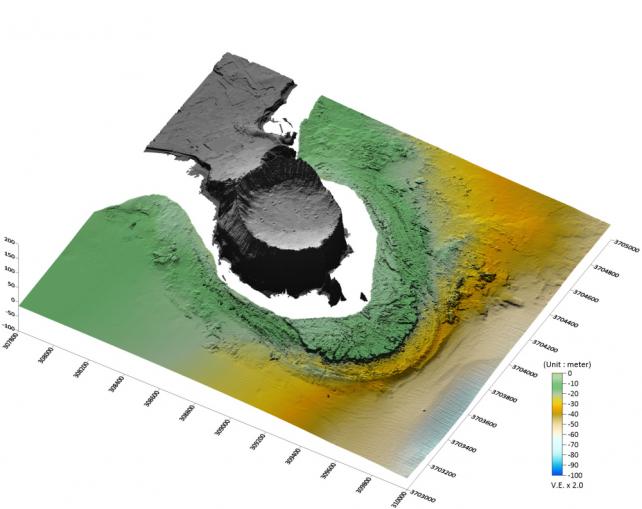 ´ÙÁߺö À½ÇâÃø½É±â¸¦ ÀÌ¿ëÇØ ¼º»êÀÏÃâºÀÀ» Áß½ÉÀ¸·Î ¹Ý°æ 3§°ÀÇ ÇØÀú ÁöÇüÀ» Á¤¹Ð Ãø·®ÇÑ °á°ú, ¼º»êÀÏÃâºÀ µ¿³²ÂÊ ¾à 500m ¶³¾îÁø ÇØÀú¸é(¼ö½É ¾à 10m)¿¡¼ Áö¸§ 600m¿¡ ´ÞÇÏ´Â ¿øÇüÀÇ ºÐȱ¸ ÈçÀûÀÌ È®ÀεƴÙ.