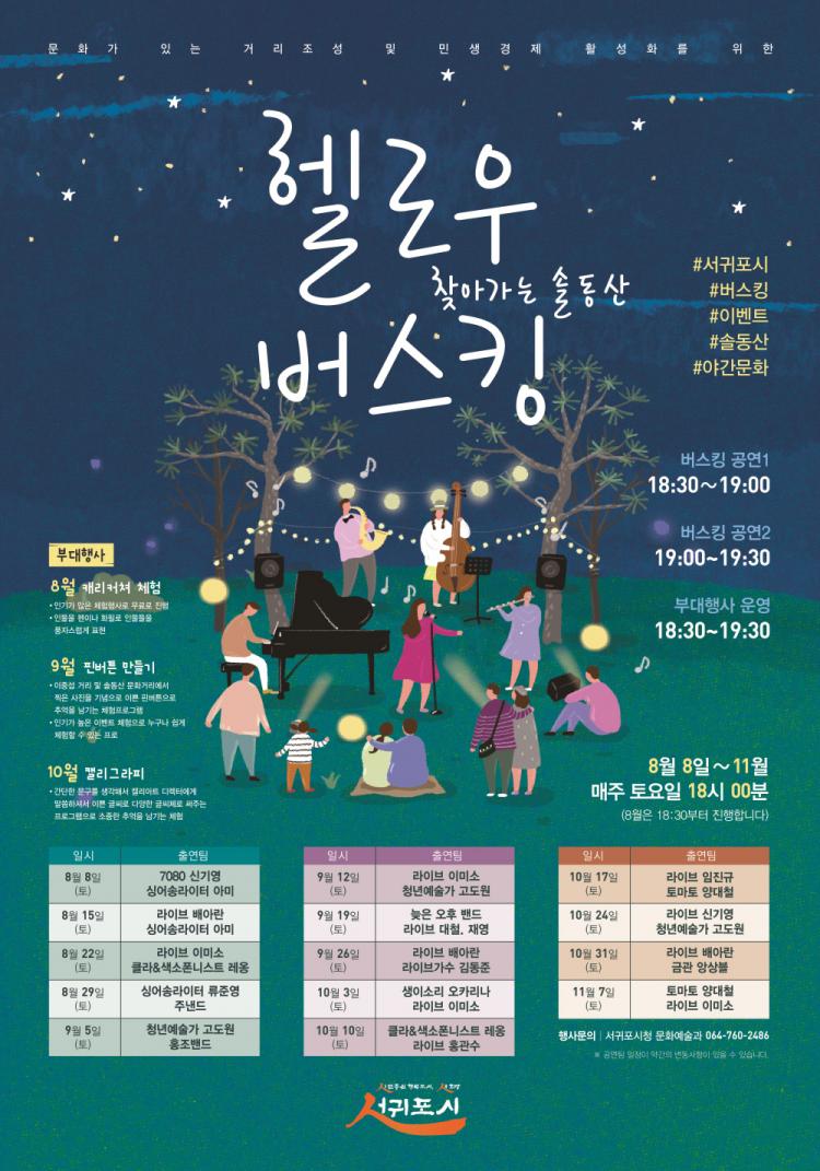 [Á¦ÁÖµµ¹Î½Å¹® = ³²Àç¿Á ±âÀÚ] ¼­±ÍÆ÷½Ã´Â 8¿ù 8ÀϺÎÅÍ 11¿ù 7ÀϱîÁö 3°³¿ù°£ ¸ÅÁÖ Åä¿äÀÏ ¼Öµ¿»ê ¹®È­ÀÇ °Å¸®¿¡¼­ ¡®Ã£¾Æ°¡´Â ¼Öµ¿»ê - Çï·Î¿ì ¹ö½ºÅ·¡¯À» ÁøÇàÇÑ´Ù°í ¹àÇû´Ù.  À̹ø ¼Öµ¿»ê ¹ö½ºÅ· °ø¿¬Àº Äڷγª19·Î Áö³­ 6°³¿ù°£ ½Ç³» °ø¿¬µéÀÌ ¿¬±â ¶Ç´Â Ãë¼ÒµÇ´Â »óȲ¿¡¼­ ½Ã¹Îµé¿¡°Õ ¸ðó·³ °ø¿¬ °ü¶÷ÀÇ ±âȸ¸¦, °ø¿¬¿¡ ¼³ ¼ö ¾ø¾ú´ø Áö¿ª ¿¹¼úÀε鿡°Ô´Â Ȱµ¿ÀÇ ±âȸ¸¦ Á¦°øÇϰí Áö¿ª »ó°¡¿¡´Â ħüµÈ °æ±â Ȱ¼ºÈ­¿¡ µµ¿òÀ» ÁÖ±â À§ÇØ ¸¶·ÃÇß´Ù.  °ø¿¬Àº ÃÑ 14ȸ¿¡ °ÉÃÄ ¸ÅÁÖ Åä¿äÀÏ¿¡ ¸¶·ÃµÇ¸ç 8¿ù ÇÑ ´ÞÀº ¹«´õÀ§·Î ÀÎÇØ ¿ÀÈÄ 6½Ã 30ºÐºÎÅÍ, 9¿ùºÎÅÍ 11¿ù±îÁö´Â ¿ÀÈÄ 6½ÃºÎÅÍ 1½Ã°£ 30ºÐ µ¿¾È ÁøÇàµÈ´Ù.  ¹®È­µµ½Ã ¼­±ÍÆ÷¸¦ ´ëÇ¥ÇÏ´Â Áö¿ª °¡¼öµé°ú ½Ì¾î¼Û¶óÀÌÅ͵éÀÌ Âü¿©ÇÏ¿© ¼­±ÍÆ÷¸¸ÀÇ Æ¯»öÀÖ´Â ¹ö½ºÅ· °ø¿¬À» ¼±º¸ÀÏ ¿¹Á¤ÀÌ´Ù.  8¿ù 8ÀÏ ¡®7080 ½Å±â¿µ¡¯, ¡®½Ì¾î¼Û¶óÀÌÅÍ ¾Æ¹Ì¡¯ÀÇ °ø¿¬À» ½ÃÀÛÀ¸·Î Äڷγª19·Î ÀÎÇØ Èûµé¾îÇÏ´Â ½Ã¹ÎµéÀ» À§·ÎÇÏ´Â 3°³¿ù°£ÀÇ ¿©Á¤À» ¶°³­´Ù. ¶Ç ¿ùº°·Î ij¸®Ä¿ÃÄ ±×¸®±â, ÇɹîÁö ¸¸µé±â, Á¦ÁÖ¾î ͏®±×¶óÇÇ µî Ư»ö ÀÖ´Â ºÎ´ëÇà»ç¸¦ ¸¶·ÃÇØ ¹«·á üÇèÅä·Ï ÇÒ ¿¹Á¤ÀÌ´Ù.  ¼­±ÍÆ÷½Ã °ü°èÀÚ´Â ¡°¾ÕÀ¸·Î »ýȰ¹æ¿ªÁöħÀ» ÁؼöÇϸ鼭 ´Ù¾çÇÑ ¼Ò±Ô¸ð ÇüÅÂÀÇ ¹®È­¿¹¼ú °ø¿¬À» Á¶±Ý¾¿ ÁøÇàÇØ ³ª°¥ °èȹ¡±ÀÌ¸ç ¡°ºñ´ë¸é ¹®È­°¡ ÀÏ»óÀÌ µÈ ´º³ë¸Ö ¹®È­ ½Ã´ë¿¡ ´ëÀÀÇÏ´Â ´Ù¾çÇÑ ¹®È­ ÄÜÅÙÃ÷¸¦ Áö¿øÇÔÀ¸·Î½á ¹®È­µµ½Ã´Ù¿î ¿¹¼úÇà»çÀÇ ´Ùº¯È­¸¦ ²ÒÇÒ ¹æÄ§¡±À̶ó°í ¸»Çß´Ù.