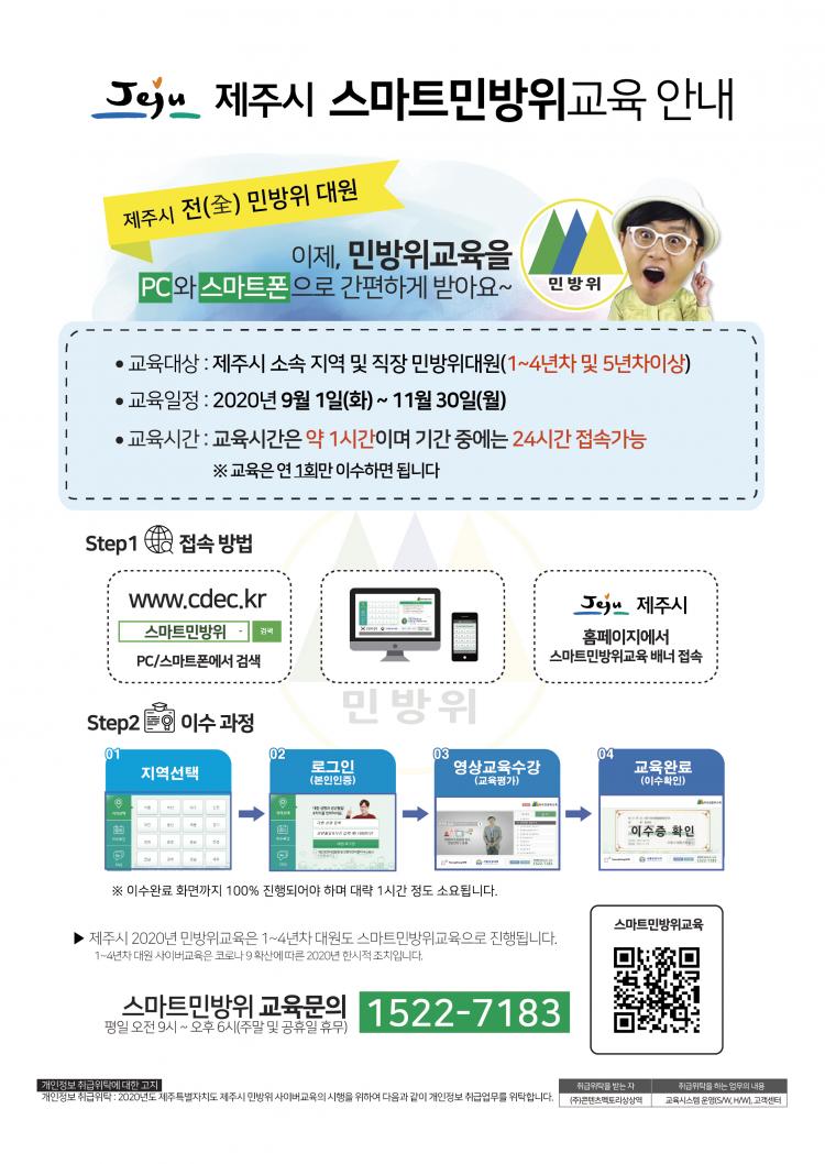 ¹Î¹æÀ§´ë¿øÀº 9. 1.(È) ~ 11. 30.(¿ù) ±â°£ Áß Á¦ÁÖ½Ãû ȨÆäÀÌÁö³ª ÀÎÅÍ³Ý Æ÷ÅлçÀÌÆ®¸¦ ÅëÇØ ¡°½º¸¶Æ®¹Î¹æÀ§±³À°(www.cdec.kr)¡±¿¡ Á¢¼ÓÇÏ¿© º»ÀÎÀÎÁõÀ» °ÅÃÄ 1½Ã°£ÀÇ ±³À°À» ¹ÞÀ¸¸é µÈ´Ù.