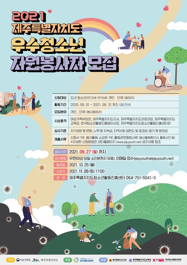 Âü°¡ ´ë»óÀ¸·Î´Â Á¦ÁÖÁö¿ª û¼Ò³â(¸¸13~19¼¼) ¹× ´Üü(µ¿¾Æ¸®) ºÎ¹®À¸·Î ½ÅûÇÒ ¼ö ÀÖÀ¸¸ç, ÃÖ±Ù 1³â°£(2020³â 9¿ù 1ÀÏ~2021³â 8¿ù 31ÀÏ) Âü¿©ÇÑ È°µ¿¿¡ ´ëÇØ ½ÅûÀÌ °¡´ÉÇÏ´Ù.
