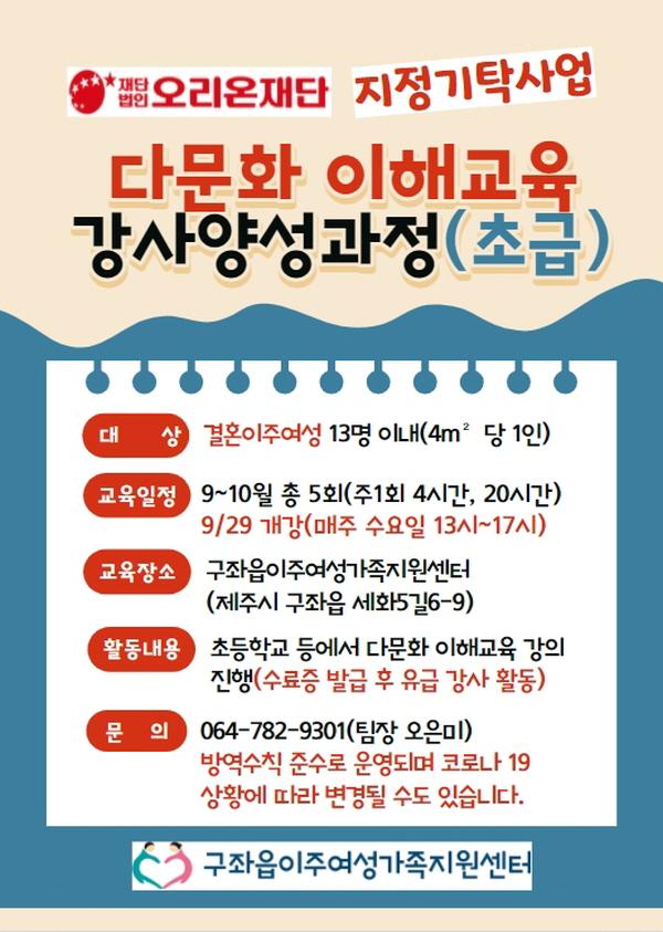 ÇÑÆí, ±³À°ÀÏÁ¤Àº 9¿ù 29ÀϺÎÅÍ 10¿ù 27ÀϱîÁö ¸ÅÁÖ ¼ö¿äÀÏ È¸´ç 4½Ã°£¾¿ ÃÑ 5ȸ 20½Ã°£À¸·Î ¿î¿µµÇ¸ç, ¹®ÀÇ´Â ±¸ÁÂÀ¾ÀÌÁÖ¿©¼º°¡Á·Áö¿ø¼¾ÅÍ·Î ÇÏ¸é µÈ´Ù(T.064-782-9301).