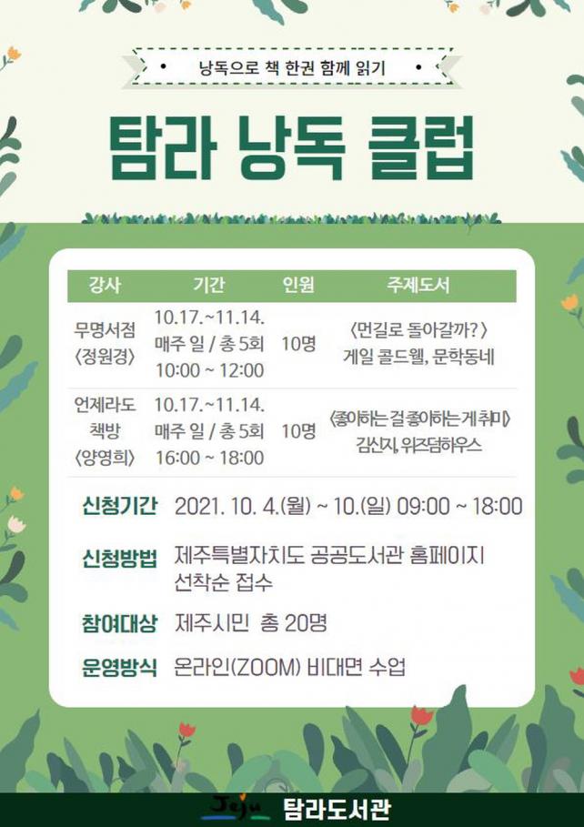 <Ž¶ó ³¶µ¶ Ŭ·´>Àº ¿Â¶óÀÎÀ¸·Î ÁøÇàµÇ¸ç, Âü°¡ ½ÅûÀº ³¶µ¶ ¸ðÀÓ¿¡ °ü½É ÀÖ´Â ½Ã¹Î 20¸íÀ» ´ë»óÀ¸·Î ¿À´Â 10¿ù 4ÀϺÎÅÍ 10ÀϱîÁö °ø°øµµ¼°ü ȨÆäÀÌÁö(www.jeju.go.kr/lib)¿¡¼ ¼±Âø¼øÀ¸·Î Á¢¼ö¹Þ´Â´Ù.