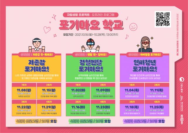 ¡®Æ÷±â¸¶¿ä Çб³¡¯´Â ¡®¹«¾÷»ó»ç¡¯»ç¾÷ÀÇ ÀÏȯÀ¸·Î ÀÚÁ¸°¨°ú ¶Ç·¡°ü°è¿¡ °í¹ÎÀÌ Àִ û³âµé¿¡°Ô ½É¸®Áø´Ü ¹× ÇØ°áÃ¥À» Á¦½ÃÇÏ¿© û³âÀÇ ±àÁ¤ÀûÀÌ°í ´Éµ¿ÀûÀÎ ÀÚ¸³»ýȰ¿¡ µµ¿òÀ» ÁÖ´Â ÇÁ·Î±×·¥ÀÌ´Ù.