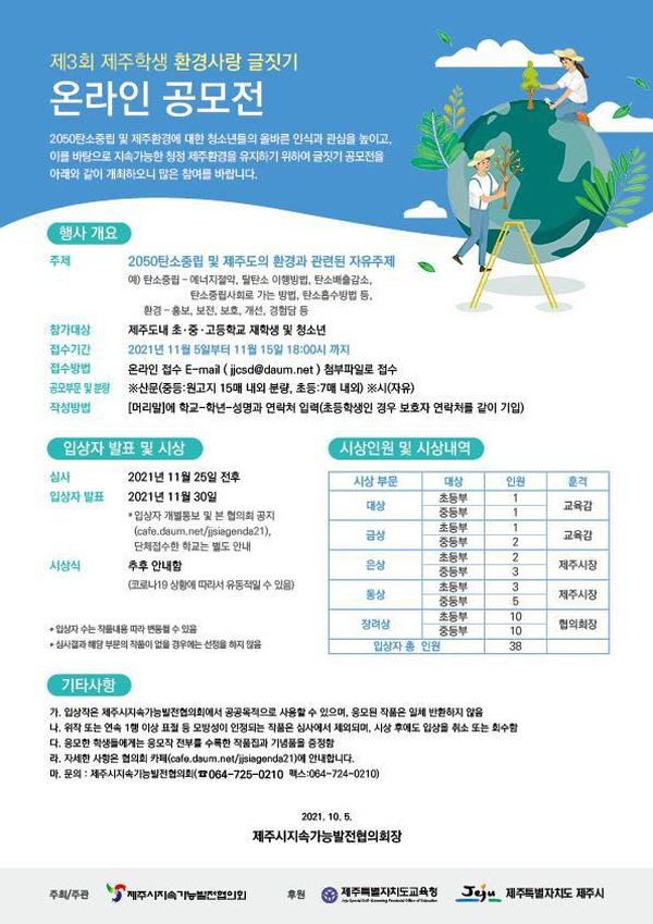 °ø¸ð ÁÖÁ¦´Â 2050ź¼ÒÁ߸³ ¹× Á¦ÁÖȯ°æ¿¡ ´ëÇÑ ÀÚÀ¯ ÁÖÁ¦À̸ç, »ê¹® ¶Ç´Â ½Ã¸¦ ÀÛ¼ºÇÏ¿© 11¿ù 5ÀϺÎÅÍ 15ÀϱîÁö Á¦Áֽà Áö¼Ó°¡´É¹ßÀüÇùÀÇȸ À̸ÞÀÏ(jjcsd@daum.net)·Î Á¦ÃâÇÏ¸é µÈ´Ù.