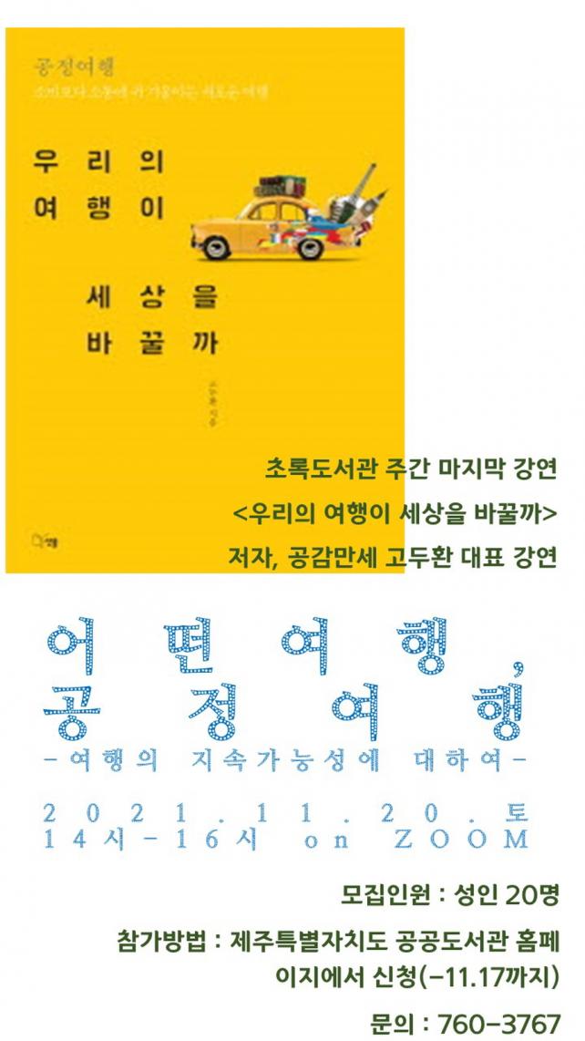 ¼ºÀÎ 20¸íÀ» ´ë»óÀ¸·ÎÇϸç, 11¿ù 17ÀϱîÁö Á¦ÁÖÆ¯º°ÀÚÄ¡µµ °ø°øµµ¼°ü ȨÆäÀÌÁö(http://lib.jeju.go.kr)¿¡¼ ½Åû°¡´ÉÇÏ´Ù. ¶ÇÇÑ, °¿¬ ÀÌÈÄ 11¿ù 25ÀÏ¿¡´Â °íµÎȯ ´ëÇ¥ÀÇ Àú¼¡¸¿ì¸®ÀÇ ¿©ÇàÀÌ ¼¼»óÀ» ¹Ù²Ü±î¡¹¸¦ Áö¿ªÁֹΰú ÇÔ²² Àаí Åä·ÐÇÏ´Â ½Ã°£À» °¡Áú ¿¹Á¤ÀÌ´Ù.