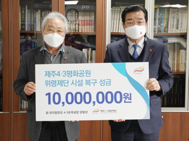 Á¦ÁÖ4‧3ÆòÈÀç´Ü(ÀÌ»çÀå ¾çÁ¶ÈÆ)Àº 25ÀÏ 4‧3Æòȱâ³ä°ü¿¡¼ ¾çºÀõ Àü ÇöÀÇÇÕÀ幦4‧3À¯Á·È¸ÀåÀÇ ±âŹ±Ý Àü´Þ½ÄÀ» °¡Á³´Ù.