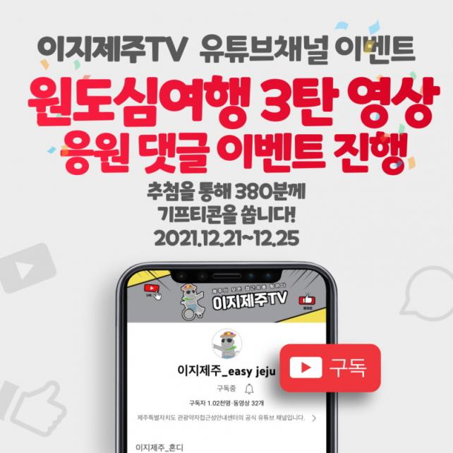 ÀÌ À̺¥Æ®´Â 12¿ù 21ÀϺÎÅÍ 25ÀϱîÁö 5Àϰ£ ÁøÇàµÉ ¿¹Á¤ÀÌ´Ù. À̺¥Æ® ³»¿ëÀº °£´ÜÇÏ´Ù. ÀÌÁöÁ¦ÁÖTV À¯Æ©ºê ä³Î¿¡ Á¢¼ÓÇÏ¿© 12¿ù 21ÀÏ ¾÷µ¥ÀÌÆ®µÇ´Â ¡¯[ÀÌÁöÁ¦ÁÖ_È¥µð]¿øµµ½É ¿©Çà 3ꡝ ¿µ»ó ½ÃûÀ» ½ÃûÇϰí, ¿øµµ½É¿©Çà ÀÌÁöÁ¦ÁÖTV ¸®Æ÷ÅÍ¿¡°Ô µûµíÇÑ ÀÀ¿ø ¸Þ½ÃÁö¸¦ ´ñ±Û·Î ÀÛ¼º, ¿µ»ó ¼³¸í¿¡ ¸µÅ©¸¦ ÅëÇÏ¿© »óǰÀ» ¼ö·ÉÇÒ ¼ºÇÔ, ¿¬¶ôó µîÀ» ±âÀÔÇØ ÁÖ¸é µÈ´Ù. Âü¿©ÇØ ÁֽŠºÐµé Áß 380¸íÀ» Ãß÷ÇÏ¿© ¼ÒÁ¤ÀÇ ¼±¹°À» Á¦°øÇϰí ÀÖ´Ù.