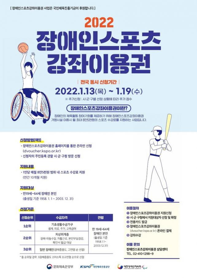 ¸¸19~64¼¼ Àå¾ÖÀÎ(Ãâ»ýÀÏ ±âÁØ 1958. 1. 1. ~ 2003. 12. 31.)À» ´ë»óÀ¸·Î ½ºÆ÷Ã÷ °Á ¼ö°·á ¿ù ÃÖ´ë 8¸¸5õ ¿øÀÌ Áö¿øµÈ´Ù.½ÅûÀº Àå¾ÖÀνºÆ÷Ã÷°ÁÂÀÌ¿ë±Ç ȨÆäÀÌÁö(https://dvoucher.kspo.or.kr)¸¦ ÅëÇØ ½ÅûÇÒ ¼ö ÀÖ´Ù. ¶ÇÇÑ Áֹεî·Ï»ó °üÇÒ À¾¡¤¸é¡¤µ¿ Áֹμ¾Å͸¦ ¹æ¹®ÇÏ¸é ¼¸é ½Åûµµ °¡´ÉÇÏ´Ù. ´ë»óÀÚ´Â 1. 20. ~ 1. 26. ±â°£ Áß ¿ì¼±¼øÀ§¿¡ Àǰм±Á¤µÈ´Ù.
