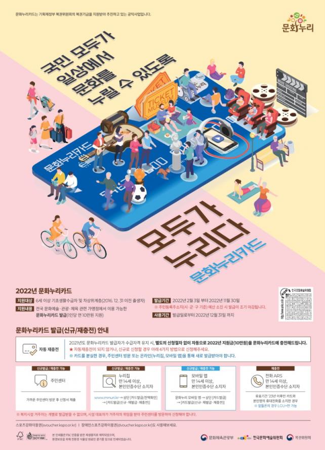 ´ë»óÀÚ´Â 6¼¼ ÀÌ»ó(2016³â 12¿ù 31ÀÏ ÀÌÀü Ãâ»ýÀÚ) ±âÃÊ»ýȰ¼ö±ÞÀÚ¿Í Â÷»óÀ§°èÃþÀ̸ç, ¿ÃÇØ ¼±ÍÆ÷½ÃÀÇ ´ë»óÀÚ´Â 12,878¸íÀ¸·Î Àü³âµµ 11,651¸í ´ëºñ 1,227¸í(10.5%) Áõ°¡Çß´Ù. ¹®È´©¸®Ä«µå´Â ±âÃÊ»ýȰ¼ö±ÞÀÚ¿Í Â÷»óÀ§°èÃþÀ» ´ë»óÀ¸·Î ¹®È¿¹¼ú, ¿©Çà, üÀ°È°µ¿ ºÐ¾ß¿¡ »ç¿ëÇÒ ¼ö ÀÖµµ·Ï ¿¬°£ 10¸¸¿øÀ» Áö¿øÇÏ´Â Ä«µå´Ù.