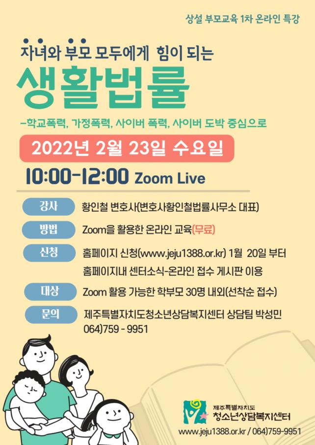À̹ø »ó¹Ý±â ºÎ¸ð ´ë»ó ¿Â¶óÀΠƯ°Àº 2¿ù 23ÀÏ È²ÀÎö º¯È£»çÀÇ ¡°ºÎ¸ð¿Í ÀÚ³à ¸ðµÎ¿¡°Ô ÈûÀÌ µÇ´Â »ýȰ¹ý·ü¡±À» ½ÃÀÛÀ¸·Î 3¿ù¿¡´Â ¾ö¸¶ ¹Ý¼º¹® ÀúÀÚ ÀÌÀ¯³² ±³ÀåÀÇ ¡°(°¡Á¦)ºÎ¸ð´ÔÀÌ ²À! ¾Ë¾ÆµÎ¸é ÁÁÀº ÀÚ³à ¾çÀ°¹ý¡±, 4¿ù¿¡´Â ¾ÆÇϼ¿ï½Ã¸³¼º¹®È¼¾ÅÍÀÇ ¡°´çȲÇÏÁö ¾Ê°í ÀÚ³à¿Í ´ëÈÇÏ´Â ÀÚ³à ¼º±³À°¡±, 5¿ù¿¡´Â Á¤ÇöÁÖ ±ÝÀ¶±³À° Àü¹®°¡ÀÇ ¡°º¯ÈÇÏ´Â ½Ã´ëÀÇ ¶È ºÎ·¯Áö´Â ÀÚ³à °æÁ¦±³À°¡±À» ÁÖÁ¦·Î ÀÌ·ç¾îÁø´Ù.