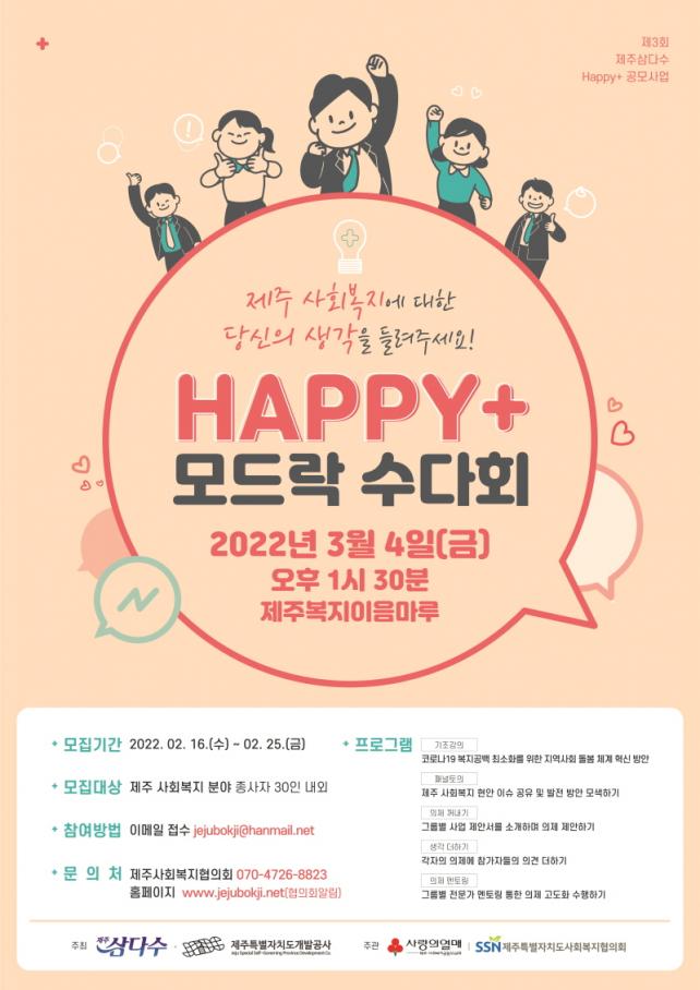 ¡®Happy+ ¸ðµå¶ô ¼ö´Ùȸ¡¯´Â Á¦ÁÖ°³¹ß°ø»ç¿¡¼ ¸Å³â ½ÃÇàÇÏ´Â ¡®Happy+ °ø¸ð»ç¾÷¡¯À» ½ÃÇàÇϱ⿡ ¾Õ¼ ¼ö¿äÀÚ Áß½ÉÀÇ ¸ÂÃãÇü º¹ÁöÀ̽´¸¦ ¹ß±¼Çϰí Áö¼Ó°¡´ÉÇÑ Áö¿ª»çȸ µ¹º½Ã¼°è ¹æ¾È°ú º¹Áö ¼ºñ½º Çõ½Å»ç·Ê¸¦ °øÀ¯Çϱâ À§ÇØ ¸¶·ÃµÈ Âü¿©Çü ¿öÅ©¼¥À¸·Î Á¦ÁÖ°³¹ß°ø»ç°¡ ÁÖÃÖÇϰí, Á¦ÁÖ»çȸº¹Áö°øµ¿¸ð±Ýȸ, Á¦ÁÖ»çȸº¹ÁöÇùÀÇȸ°¡ °øµ¿À¸·Î ÁÖ°üÇÏ°Ô µÈ´Ù