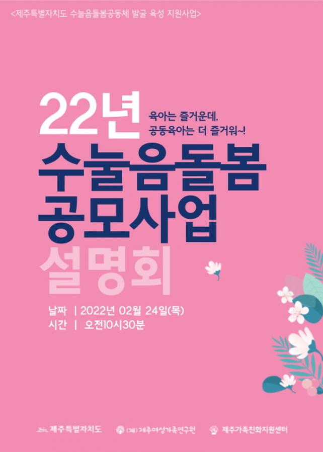 ¼ö´À½µ¹º½°øµ¿Ã¼´Â 0¼¼~Ãʵî 6Çгâ±îÁö µ¹º½¾Æµ¿À» µÐ 5°¡±¸ ÀÌ»óÀÇ ¸ðÀÓÀ» ¸»ÇÏ¸ç ¼±Á¤ ÈÄ °øµ¿Ã¼º° ÃÖ´ë 150¸¸¿ø À̳»ÀÇ È°µ¿ºñ¸¦ Áö¿ø¹Þ°Ô µÈ´Ù. ¿ÃÇØ »ç¾÷ ¼³¸íȸ´Â ZoomÀ¸·Î ÁøÇàµÇ¸ç 22³â »ç¾÷ °³¿ä, °ø¸ð ÃßÁø ÀýÂ÷ ¹× ÀÏÁ¤, °ø¸ð ½Åû ¹æ¹ý µîÀ» ÀÚ¼¼ÇÏ°Ô ¾È³»ÇÒ ¿¹Á¤ÀÌ´Ù. À̹ø »ç¾÷ ¼³¸íȸ¿¡ °ü½É ÀÖ´Â Á¦ÁÖ µµ¹ÎµéÀº Á¦ÁÖ°¡Á·Ä£ÈÁö¿ø¼¾ÅÍ È¨ÆäÀÌÁö¿¡¼ »ç¾÷¼³¸íȸ¸¦ »çÀü ½Åû ÈÄ Âü¿©ÇÏ¸é µÈ´Ù.