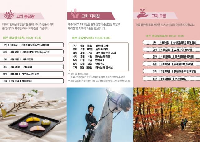 Áö¿ªÀû Ư»öÀ» »ì¸° Èú¸µ »ï´Ù Ä¡À¯ÇÁ·Î±×·¥Àº Á¦ÁÖ Ç»Àü ÇâÅä À½½ÄÀ» ¸¸µé±â¸¦ ÅëÇØ ¸ö °Ç°À» Ű¿ì´Â ¡®°íÄ¡ »Í²ø¶û¡¯, Á¦ÁÖÀÇ ¿À¸§ µî¹ÝÀ» ÅëÇØ ³»¸éÀÇ ¿µ¼ºÀ» Ű¿ì´Â ¡®°íÄ¡ ¿À¸§¡¯, Á¦ÁÖ¸¶¿ÍÀÇ ±³°¨À» ÅëÇØ ¸¶À½ °Ç°À» Ű¿ì´Â ¡®°íÄ¡ Áö²¨Áü¡¯À¸·Î ±¸¼ºµÇ¾î ÀÖ´Ù.