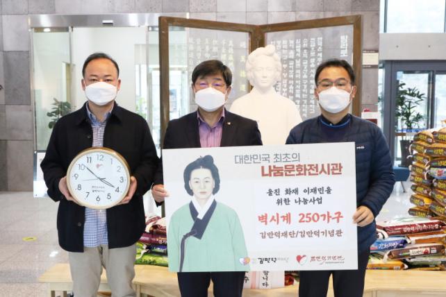 ÇÑÆí, ±è¸¸´ö±â³ä°ü ±è»óÈÆ°üÀåÀº ¡°À¯·Ê¾ø´Â »êºÒ·Î ÀÎÇØ Å« °íÅëÀ» ¹Þ°í ÀÖ´Â ¿ïÁø±º¹ÎµéÀ» º¸¸ç ¾ÈŸ±î¿î ¸¶À½ÀÌ µé¾î ¸Ö¸®¼³ª¸¶ ±è¸¸´öÀÇ Á¤½ÅÀ¸·Î ÇÔ²² ÇϰíÀÚ ½ÒÀ» ´ë½ÅÇØ ¿ïÁø±ºÀÇ ¿äûÀ¸·Î º®½Ã°è¸¦ º¸³»°Ô µÆ´Ù¡±¸ç ¡°¾ÕÀ¸·Îµµ ¾î·Á¿ò¿¡ óÇÑ ÀÌ¿ôµéÀ» À§ÇØ ±è¸¸´öÀÇ Á¤½ÅÀ¸·Î ÇÔ²² Çϰڴ١±°í ¼Ò°¨À» ÀüÇß´Ù.