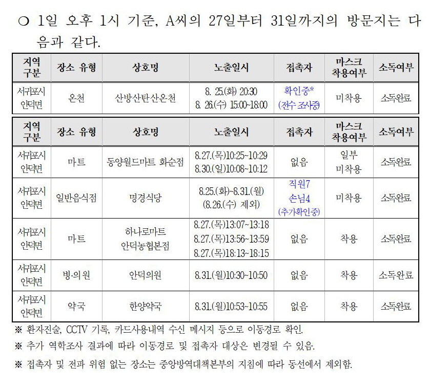 ¿ªÇÐÁ¶»ç °á°ú 27ÀϺÎÅÍ 31ÀϱîÁö(25~26ÀÏ ¹æ¹®ÇÑ »ê¹æ»êź»ê¿Âõ Á¦¿Ü) 5°÷À» ¹æ¹®Çß°í, 9¿ù 1ÀÏ ¿ÀÈÄ 1½Ã ±âÁØ ÃÑ 30¸í°ú Á¢ÃËÇÑ °ÍÀ¸·Î ÆÄ¾ÇµÆ´Ù.