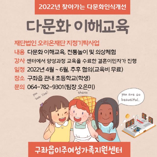 À̹ø »ç¾÷Àº ¼¾ÅÍ¿¡¼ ´Ù¹®È ÀÌÇØ±³À° °»ç¾ç¼º°úÁ¤À» ¼ö·áÇÑ ±¸ÁÂÀ¾ °áÈ¥À̹ÎÀÚµéÀÌ °ü³» ÃʵîÇб³¿¡¼ ¾Æµ¿¤ýû¼Ò³âµé¿¡°Ô ´Ù¹®È ÀÌÇØ±³À°, ÀüÅë³îÀÌ, ÀÇ»ó üÇè µîÀ» ÁøÇàÇÏ¿© Àνݳ¼±¿¡ À̹ÙÁöÇÏ°í ¿ª·®À» °ÈÇϰíÀÚ ¸¶·ÃµÇ¾ú´Ù.