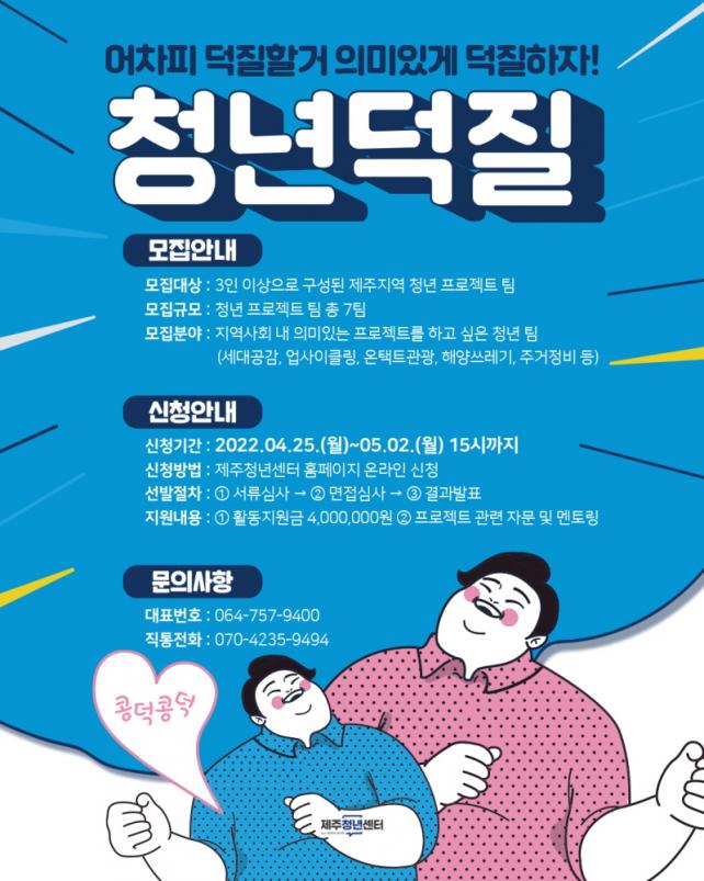 À̹ø û³â´öÁú »ç¾÷Àº Á¦ÁÖÁö¿ª¿¡¼ °ÅÁÖ ¶Ç´Â Ȱµ¿Çϰí ÀÖ´Â 3ÀÎ ÀÌ»ó û³â(¸¸ 19-39¼¼) ÇÁ·ÎÁ§Æ® ÆÀÀ» ´ë»óÀ¸·Î ÇÏ¸ç ÆÀ¿ø Áß ÃÖ¼Ò 2/3 ÀÌ»óÀÌ °ÅÁÖ ¹× Ȱµ¿Á¶°ÇÀ» ÃæÁ·ÇÏ¸é ½ÅûÀÌ °¡´ÉÇÏ´Ù.
