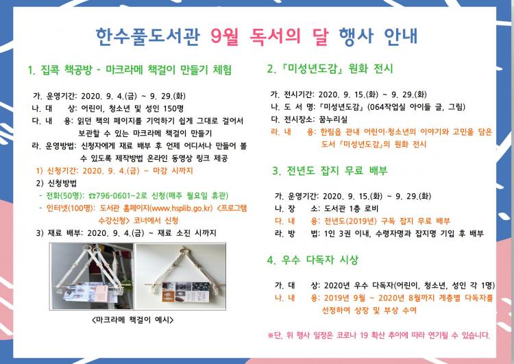 ÇѼöÇ®µµ¼­°ü, 2020³â 9¿ù µ¶¼­ÀÇ ´Þ Çà»ç ¿î¿µ