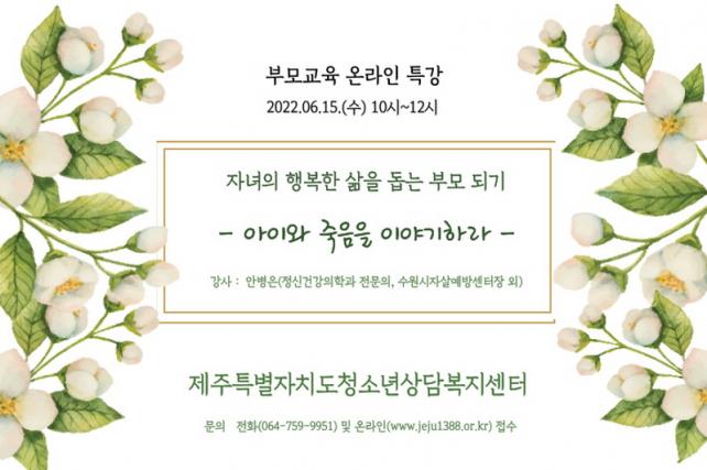 À̹ø Ư°Àº Áö¿ª ÇÐºÎ¸ð¿¡°Ô Ã»¼Ò³â ÀÚÇØ Çൿ°ú ÀÚ»ì Ãæµ¿ÀÇ ÀÌÇØ¸¦ µµ¸ðÇÏ¿©, ºÎ¸ð-ÀÚ³à °ü°è¿¡ °Ç°ÇÏ°Ô ¼ÒÅëÇϰí ÇູÇÑ »îÀ» µ½±â À§ÇØ ¸¶·ÃÇÏ¿´´Ù. Çкθð´Â ¹°·Ð û¼Ò³â±â ÀÚ³à ±³À°¿¡ °ü½ÉÀÌ ÀÖ´Â µµ¹ÎÀ̶ó¸é ´©±¸³ª ¹«·á·Î Âü¿© °¡´ÉÇϸç, ½ÅûÀº ¼¾ÅÍ È¨ÆäÀÌÁö(www.jeju1388.or.kr), ¹®ÀÇ »çÇ×Àº 064-759-9951(´ã´çÀÚ ½Å¼±¾Æ)·Î ÇÏ¸é µÈ´Ù.