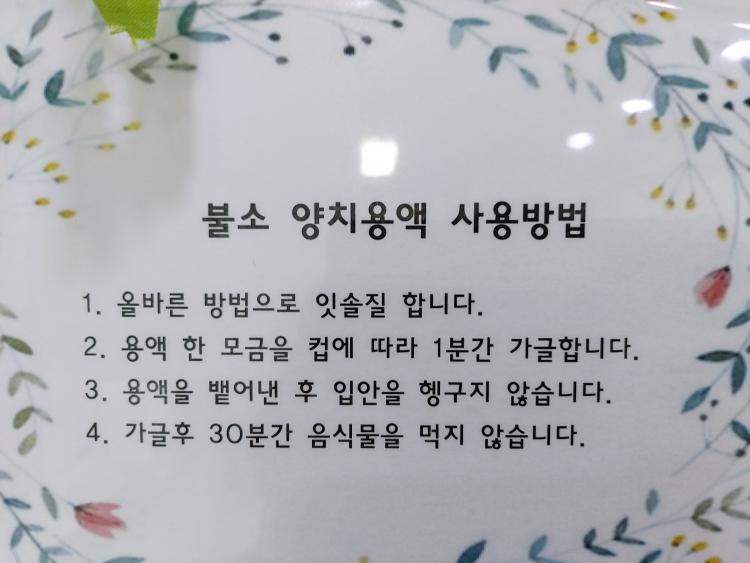 ºÒ¼Ò¾çÄ¡ ¿ë¾×Àº 0.05%ÀÇ ºÒȳªÆ®·ý(NaF) ¿ë¾×À¸·Î ¾çÄ¡ ½Ã ÀԾȿ¡ ³²¾ÆÀÖ´Â ¾çÀº ¼Ò·®À¸·Î ÀÎü¿¡ ÀüÇô ÇØ°¡ ¾øÀ¸¸ç, 1ÀÏ 1ȸ »ç¿ëÀ¸·Î ±¸°Áúȯ ¿¹¹æ¿¡ ¸Å¿ì È¿°úÀûÀÌ´Ù.
