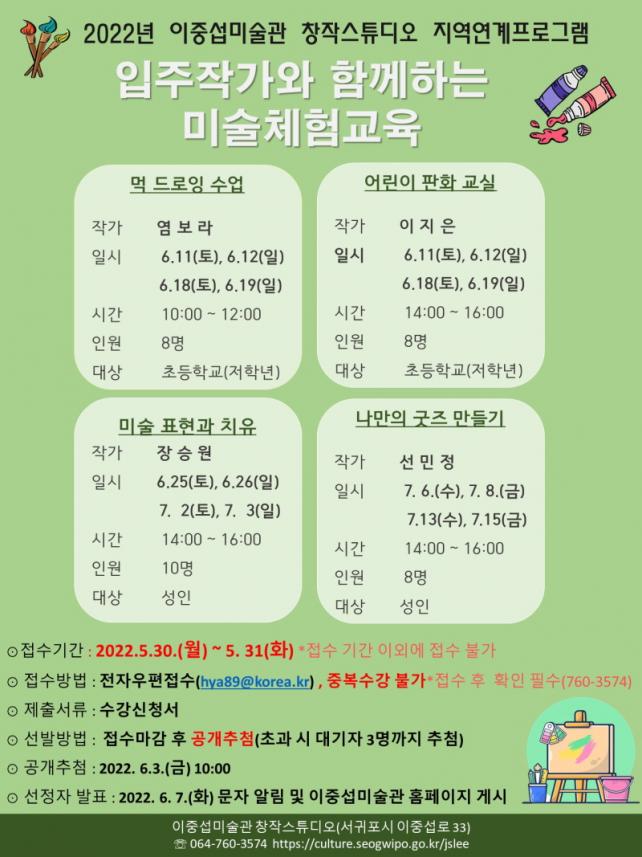 °¢ ÇÁ·Î±×·¥Àº 4ȸ¾¿ ¿î¿µµÇ¾î ÃʵîÇб³ ÀúÇгâÀ» ´ë»óÀ¸·Î ÇÏ´Â ¿°º¸¶ó ÀÛ°¡ÀÇ <¸Ô µå·ÎÀ×>, ÀÌÁöÀº ÀÛ°¡ÀÇ <¾î¸°ÀÌ ÆÇȱ³½Ç>¼ö¾÷Àº °¢ 8¸í¾¿ ¸ðÁýÇÒ ¿¹Á¤ÀÌ¸ç ¼ºÀÎÀ» ´ë»óÀ¸·Î ÇÏ´Â Àå½Â¿ø ÀÛ°¡ÀÇ <¹Ì¼ú Ç¥Çö°ú Ä¡À¯> ¼ö¾÷Àº 10¸í, ¼±¹ÎÁ¤ ÀÛ°¡ÀÇ <³ª¸¸ÀÇ ±ÂÁµé±â> ¼ö¾÷Àº 8¸í ¸ðÁýÇÒ ¿¹Á¤ÀÌ´Ù. °ü³» °ÅÁÖÇÏ´Â ÃʵîÇлý ¹× ¼ºÀÎÀÌ¸é ´©±¸³ª ½Åû°¡´ÉÇÏ´Ù.
