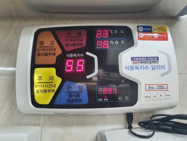 ½ÄÁßµ¶Áö¼ö ¾Ë¸®¹Ì Àü±¤ÆÇÀº Á¶¸®Àå ³»ÀÇ ¿Âµµ¿Í ½Àµµ¸¦ ÃøÁ¤ÇØ ½Ç½Ã°£ ½ÄÁßµ¶Áö¼ö¸¦ Ç¥½ÃÇϰí, °ü½É(ÆÄ¶û), ÁÖÀÇ(³ë¶û), °æ°í(ÁÖȲ), À§Çè(»¡°) µî ½ÄÁßµ¶ À§ÇèÀ» 4´Ü°è·Î ³ªÅ¸³½´Ù. À̸¦ ÅëÇØ Á¶¸® Á¾»çÀÚ°¡ À½½Ä¹° Ãë±Þ °úÁ¤¿¡ ÀÖ¾î ¼¼½ÉÇÑ ÁÖÀǸ¦ ±â¿ïÀ̵µ·Ï À¯µµÇÔÀ¸·Î½á ½ÄÁßµ¶À» »çÀü¿¡ Â÷´ÜÇÏ´Â µ¥ µµ¿òÀ» ÁÖ°Ô µÈ´Ù.
