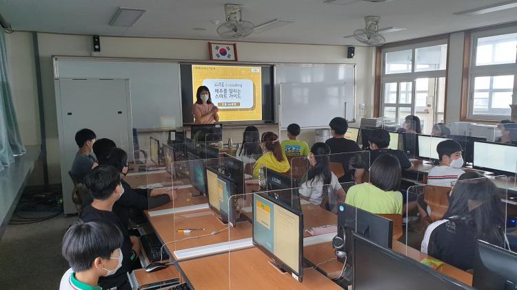 [Á¦ÁÖµµ¹Î½Å¹® = ¿ÀÁØÇõ ±âÀÚ] ¼¼È­ÃʵîÇб³(±³Àå ¹éÈ«½Ç)´Â 9¿ù 11ÀÏ(±Ý) 6Çгâ ÇлýÀ» ´ë»óÀ¸·Î º»±³ ÄÄÇ»ÅÍ½Ç ¹× 6Çг⠱³½Ç¿¡¼­ ¿ÜºÎ°­»ç ÃÊû ¡®Á¦ÁַοÂÄÚµù¡¯Ã¼Çè ÇÁ·Î±×·¥À» ¿î¿µÇß´Ù. À̹ø ÇÁ·Î±×·¥Àº [Á¦ÁÖ¸¦ ¾Ë¸®´Â ½º¸¶Æ® °¡À̵å], [½Å³ª´Â Á¦ÁÖ¸®±×], [Hi, AI! ³ª¸¦ ¸ÂÃçºÁ!] µîÀÇ ÁÖÁ¦·Î ºí·° ÄÚµù, ·Îº¿ ¹× AI Ȱ¿ë SW(¼ÒÇÁÆ®¿þ¾î)±³À°À» ÁøÇàÇß´Ù. À̹ø ÇÁ·Î±×·¥À» ÅëÇØ ÇлýµéÀÌ ¼ÒÇÁÆ®¿þ¾î¿¡ °ü½ÉÀ» °®°í ÄÄÇ»ÅÍ ¾Ë°í¸®Áò°ú ÄÚµùÀÇ ±âº»À» ÀÍÈ÷¸ç ¾ÆÀ̵ð¾î¸¦ Á¢¸ñÇÏ¿© ÄÄÇ»ÆÃ ¹®Á¦ÇØ°á ´É·ÂÀ» ±â¸¦ ¼ö Àֱ⸦ ±â´ëÇØº»´Ù.