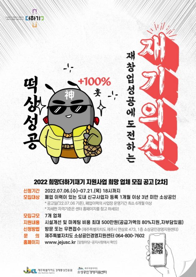 À̹ø »ç¾÷Àº Æó¾÷ ÈÄ ´Ù½Ã »ç¾÷À» ½ÃÀÛÇÑ Á¦ÁÖÁö¿ª ¼Ò»ó°øÀÎ Áß ¿ª·® ÀÖ´Â ¾÷ü¸¦ ¼±Á¤ÇÏ¿© Àç±â ¼º°ø·üÀ» ³ôÀ̱â À§ÇÑ ½Ã¼³ºñ¿ë ¹× ±³À° µîÀ» Áö¿øÇÑ´Ù. Áö³ 3¿ù 1Â÷ ¸ðÁý¿¡ À̾î ÇϹݱâ 2Â÷ ¸ðÁýÀ» ½Ç½ÃÇÏ°Ô µÆ´Ù.
