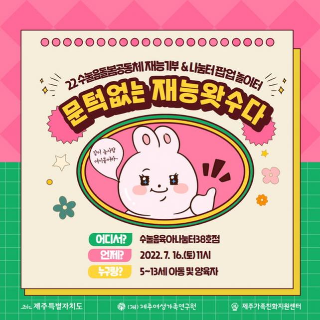 ¹®Åξø´Â Àç´É¿Ó¼ö´Ù¡¯ÆË¾÷ ³îÀÌ ÇÁ·Î±×·¥¿¡ ´ëÇÑ ÀÚ¼¼ÇÑ ¾È³»´Â Á¦ÁÖ°¡Á·Ä£ÈÁö¿ø¼¾ÅÍ È¨ÆäÀÌÁö¿Í º½Åå Ä«Æä(cafe.naver.com/dolbominjeju)¿¡¼ È®ÀÎÇÏ¸é µÈ´Ù.