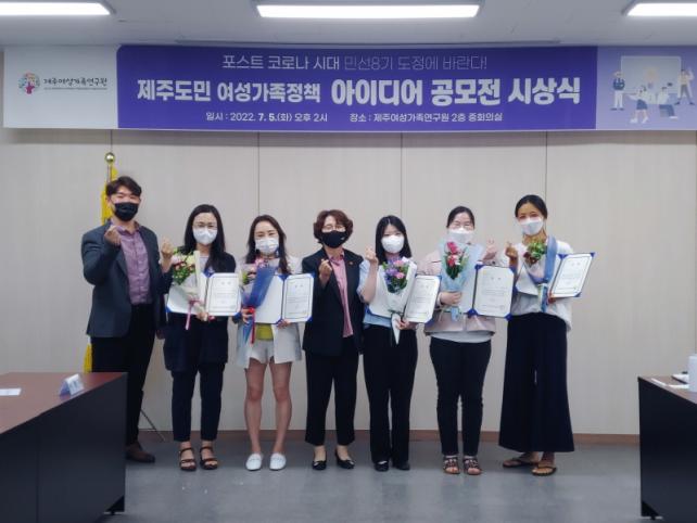 Á¦ÁÖ¿©¼º°¡Á·¿¬±¸¿ø ¹Î¹«¼÷ ¿øÀåÀº °¢°¢ÀÇ ¾ÆÀ̵ð¾î Á¦¾ÈÀÚ¿¡°Ô »óÀå°ú »ó±ÝÀ» Áö±ÞÇÔ°ú µ¿½Ã¿¡, ¼ö»óÀÚµé°úÀÇ °£´ãȸ¸¦ ÅëÇØ Áö¿ª»çȸ ³»¿¡¼ ¹ß»ýÇÏ´Â ´Ù¾çÇÑ ¿©¼º°¡Á·Á¤Ã¥ ¼ö¿ä¿¡ ´ëÇÑ ÀǰßÀ» ±³È¯ÇÏ¿´´Ù.