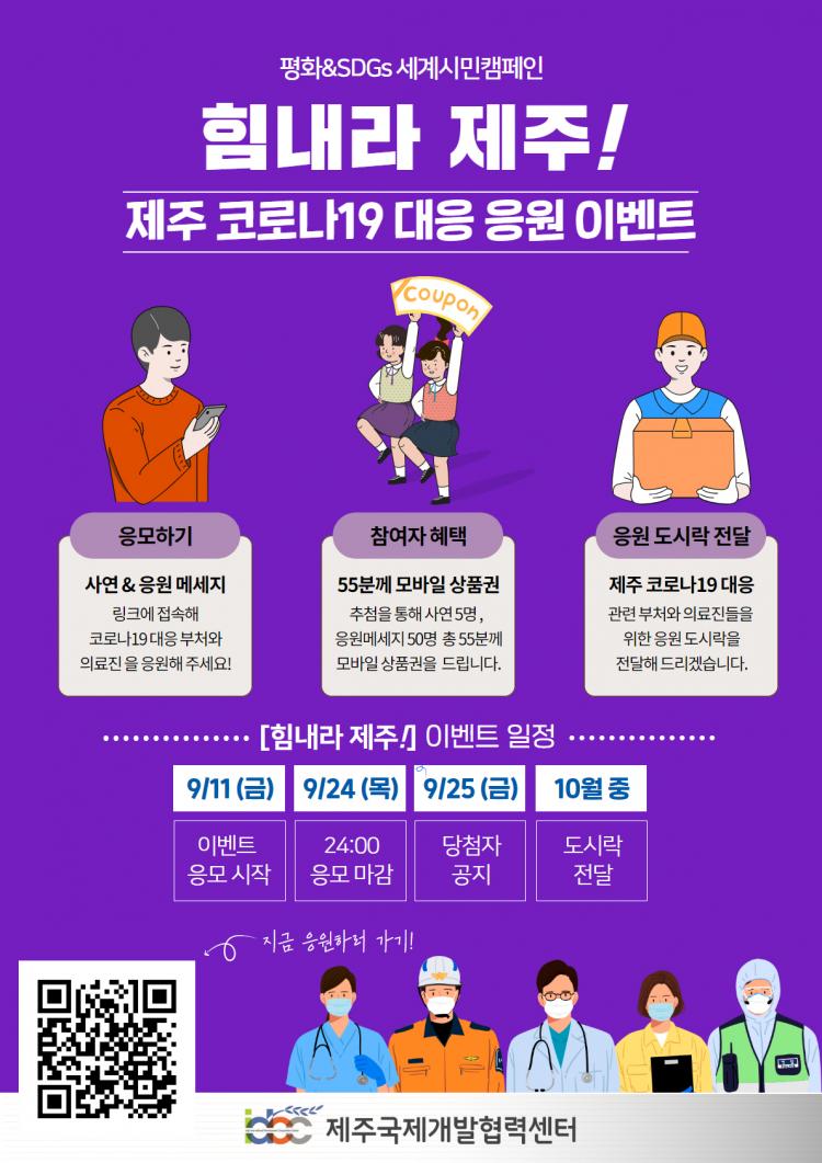 ¼¾ÅÍ´Â ÀÌ¿Í ÇÔ²² Á¦ÁÖÁö¿ª Äڷγª19 ´ëÀÀ °ü·Ã ±â°ü°ú ÀÇ·áÁø¿¡°Ô ÀÀ¿ø µµ½Ã¶ôµµ Àü´ÞÇÑ´Ù. <Èû³»¶ó Á¦ÁÖ!> ÀÀ¿ø À̺¥Æ®´Â Áö³ 11ÀÏ ½ÃÀ۵Š¿À´Â 24ÀÏ ÀÚÁ¤±îÁö ÁøÇàµÈ´Ù. Á¦ÁÖ Äڷγª19 ´ëÀÀ °ü·Ã ºÎó¿Í ÀÇ·áÁøµé »ç¿¬À̳ª ±×µéÀ» ÀÀ¿øÇÏ´Â ¸Þ¼¼Áö¸¦ º¸³»¸é Ãß÷À» ÅëÇØ ¸ð¹ÙÀÏ »óǰ±ÇÀ» Áö±ÞÇÑ´Ù.