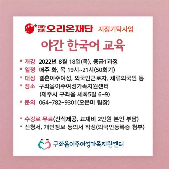 ÇÑÆí (Àç)¿À¸®¿ÂÀç´Ü¿¡¼´Â 2018³âºÎÅÍ ±¸ÁÂÀ¾ ´Ù¹®È°¡Á·°ú ü·ùÀ̹ÎÀÚ¸¦ À§ÇÑ ´Ù¾çÇÑ ÇÁ·Î±×·¥À» Áö¿øÇØ ¿ÔÀ¸¸ç, ÀÌÁß ¾ß°£ Çѱ¹¾î±³À°Àº Áö³ 4³â°£ 220ȸ±â 1,664¸íÀÌ ÇнÀÇÏ¿© »çȸ ÀûÀÀÀ» µµ¿Ô´Ù. À̿ܿ¡µµ ¼¾ÅÍ¿¡¼´Â 2023³â 1¿ùºÎÅÍ ¿À¸®¿ÂÀç´Ü Áö¿ø»ç¾÷À¸·Î ´Ù¹®È°¡Á¤ ÃʵîÇлý ÀÚ³à µ¹º½±³À°À» ÁøÇàÇÒ °èȹÀÌ´Ù. ±³À°¹®ÀÇ´Â ±¸ÁÂÀ¾ÀÌÁÖ¿©¼º°¡Á·Áö¿ø¼¾ÅÍ·Î ÇÏ¸é µÈ´Ù.(T.064-782-9301)