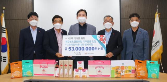 Á¦ÁÖº»ÃÊ´Â 3³â¸¸¿¡ °³ÃֵǴ 4¡¤3À¯Á·ÇѸ¶À½´ëȸ Çà»ç ÁøÇà¿¡ µµ¿òÀÌ µÉ ¼ö ÀÖµµ·Ï ÀÚ»ç Á¦ÀÛÀÇ °Ç°À½·á µî 5õ¿©¸¸¿ø »ó´çÀÇ ¹°Ç°°ú Çö±Ý 3¹é¸¸¿øÀ» ±âŹÇß´Ù.