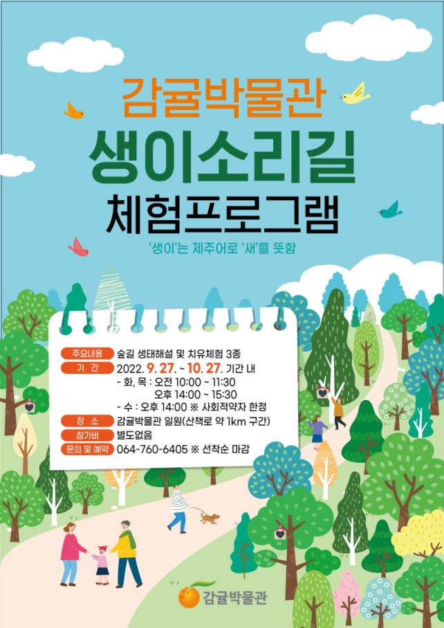 »ýÀ̼Ҹ®±æ ÇÁ·Î±×·¥Àº °¨±Ö¹Ú¹°°ü ¿ù¶óºÀ ½£±æ¡®»ýÀ̼Ҹ®±æ¡¯À» °ÉÀ¸¸ç »ýÅÂÇØ¼³, Ä¡À¯¸í»óÈ£Èí, ÁøÇÇ ÇâÁÖ¸Ó´Ï ¸¸µé±â, ¼Ò¿ø³ª¹«¿¡ ¼Ò¿ø´Þ±â µî Ä¡À¯¿Í ȸº¹°ú °ü·Ã 4°¡ÁöÀÇ ¼¼ºÎ ÇÁ·Î±×·¥À» üÇèÇÏ´Â °ÍÀ¸·Î, 064-760-6405·Î »çÀü¿¡ ¿¹¾àÇÏ¸é º°µµÀÇ Âü°¡ºñ ¾øÀÌ Âü¿©ÇÒ ¼ö ÀÖ´Ù.