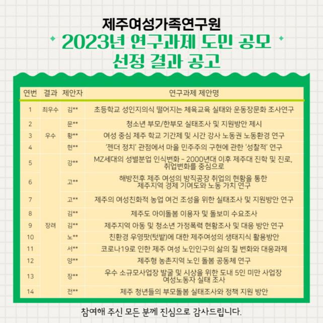 ¿¬±¸°úÁ¦ °ø¸ð´Â µµ¹ÎÀÇ ¿ä±¸¿¡ ¸Â´Â Á¤Ã¥È°¿ëµµ ³ôÀº ¿¬±¸°úÁ¦ ¹ß±¼À» À§ÇØ Áö³ 7¿ù 15ÀϺÎÅÍ 8¿ù 12ÀϱîÁö Á¦ÁÖµµ¹ÎÀ» ´ë»óÀ¸·Î ÁøÇàµÇ¾ú´Ù. À̹ø °ø¸ð¿¡´Â ´ëÇлý, ½ÅÁø ¿¬±¸ÀÚ, ±³À° ¹× »çȸº¹Áö±â°ü Á¾»çÀÚ, °ø¹«¿ø, µµÀÇ¿ø µîÀÌ Âü¿©ÇÏ¿´´Ù.