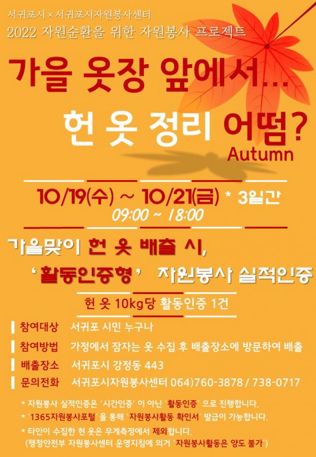 À̹ø ÀÚ¿øºÀ»ç ÇÁ·Î±×·¥Àº ¿ÃÇØ 4¿ù(4/20~4/22) 1ȸÂ÷, 7¿ù(7/20~7/22) 2ȸÂ÷ ¼öÁý »ç¾÷¿¡ ÀÌÀº 3ȸÂ÷ »ç¾÷À¸·Î 10¿ùÀº °¡À»¸ÂÀÌ Çå ¿Ê ¹èÃâ Ȱµ¿ ¡¸°¡À» ¿ÊÀå ¾Õ¿¡¼ Çå ¿Ê Á¤¸® ¾î¶¶(Autumn)?¡¹À» Å׸¶·Î Á¤ÇØ ¿À´Â 10¿ù 19ÀÏ(¼ö)ºÎÅÍ 21ÀÏ(±Ý)±îÁö 3Àϰ£ ÁøÇàÇÑ´Ù.