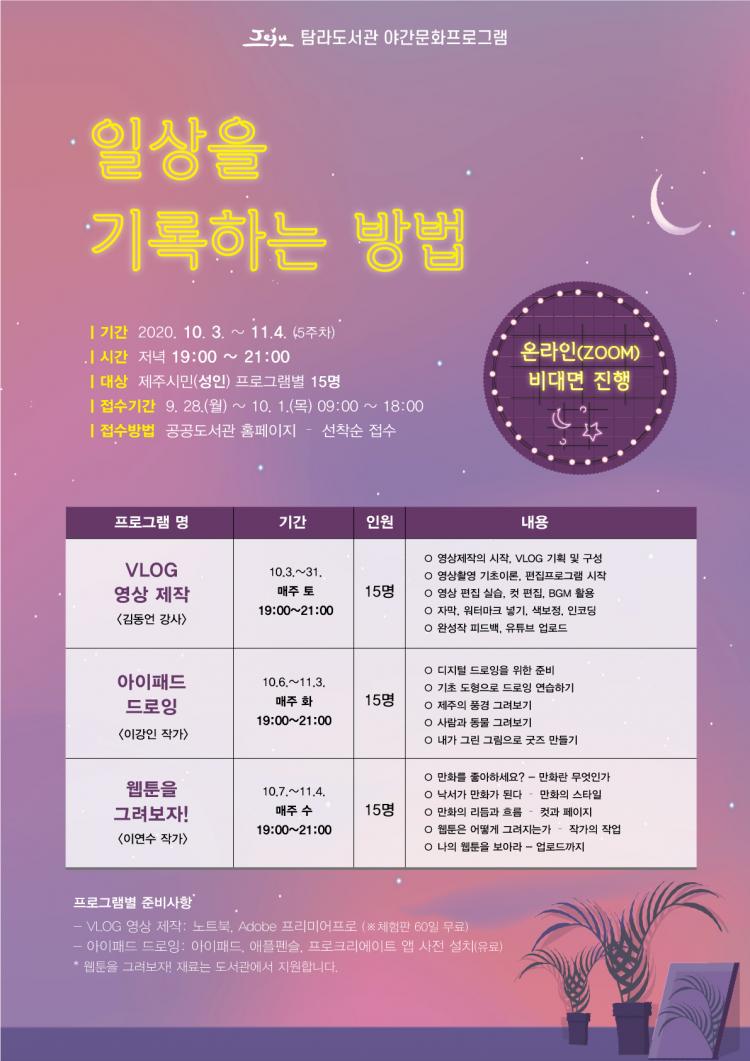 ÇÁ·Î±×·¥ Âü¿© ½Åû ±â°£Àº ¿À´Â 9¿ù 28ÀϺÎÅÍ 10¿ù 1ÀϱîÁöÀ̸ç, Á¦ÁֽùÎÀÌ¸é ´©±¸³ª ½Åû °¡´ÉÇÏ´Ù. Á¢¼ö ¹æ¹ýÀº °ø°øµµ¼°ü ȨÆäÀÌÁö(http://lib.jeju.go.kr/) ÇÁ·Î±×·¥ ½Åû¶õ¿¡¼ ÇÁ·Î±×·¥º° ¼±Âø¼ø 15¸í ±îÁö Á¢¼öÇÒ ¼ö ÀÖ´Ù.