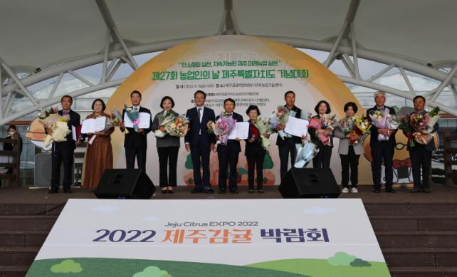 ÀÌ¿Í ÇÔ²² ¡°Á¦ÁÖ ³óÃà»ê¾÷ ÁøÈï°ú ¹ßÀü¿¡ Å« °øÀûÀ» ¼¼¿ö ÃÖ°í ³ó¾÷Àο¡ ¼±Á¤µÈ ¼ö»óÀڵ鲲 ÃàÇÏÀÇ ¸»¾¸À» µå¸°´Ù¡±°íµµ ÀüÇß´Ù.