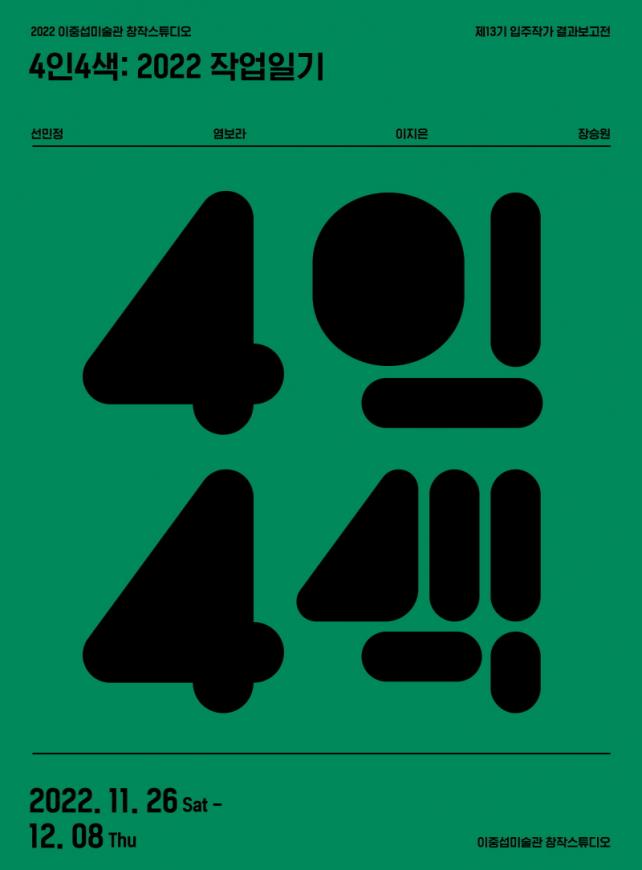 À̹ø Àü½Ã¿¡¼´Â 2022³â 13±â âÀÛ½ºÆ©µð¿À ÀÔÁÖÀÛ°¡ÀÎ ¼±¹ÎÁ¤(µ¿¾çÈ), ¿°º¸¶ó(Çѱ¹È), ÀÌÁöÀº(ÆÇÈ), Àå½Â¿ø(ȸÈ) µî 4¸íÀÇ ÀÛ°¡°¡ Âü¿©ÇÏ¿© Áö³ 1³â°£ ÀÛ¾÷ÇÑ È¸È, ¼³Ä¡ÀÛǰ 30¿©Á¡À» ¼±º¸ÀδÙ.