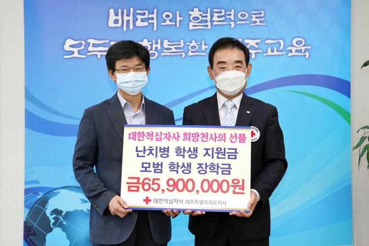 [Á¦ÁÖµµ¹Î½Å¹® = ¿À½ÂÅà ±âÀÚ] Á¦ÁÖÆ¯º°ÀÚÄ¡µµ±³À°Ã»(±³À°°¨ À̼®¹®)Àº 10¿ù 5ÀÏ(¿ù)¿¡ ´ëÇÑÀû½ÊÀÚ»ç Á¦ÁÖÆ¯º°ÀÚÄ¡µµÁö»ç(ȸÀå ¿ÀÈ«½Ä)ÀÇ ¡®Èñ¸Áõ»çÀÇ ¼±¹°¡¯Àü´Þ½ÄÀ» °¡Á³´Ù°í ¹àÇû´Ù. ¡®´ëÇÑÀû½ÊÀÚ»ç Èñ¸Á õ»çÀÇ ¼±¹°¡¯Àº Èñ¸Áõ»çÇб³ ÇлýµéÀÌ ¸ðÀº ¼º±Ý, ÈÄ¿ø±ÝÀ¸·Î ¸¶·ÃµÇ¾î µµ³» ¹éÇ÷º´, ¼Ò¾Æ¾Ï µî ³­Ä¡º´À¸·Î °íÅë¹Þ´Â Çлý 17¸í, ¸ð¹üÇлý 40¸íÀÌ ¼±Á¤µÇ¾î ÃÑ 57¸í¿¡°Ô 65,900(õ¿ø)À» Áö¿øÇÑ´Ù. ´ëÇÑÀû½ÊÀÚ»ç Á¦ÁÖÁö»ç ´ã´çÀڴ¡°³­Ä¡º´ µîÀ¸·Î °íÅë ¹Þ´Â Çлý¿¡°Ô ¸ÂÃã Áö¿ø°ú ¸ð¹üÇлý Áö¿øÀ» ÅëÇÑ Çо÷ ´É·Â Çâ»ó µî ÀÎÀç¾ç¼ºÀ» À§ÇÔ¡±À̶ó°í »ç¾÷ÀÇ ÃëÁö¸¦ ÀüÇß´Ù. ¾Õ¼­ 6¿ù¿¡´Â µµ³» Àú¼ÒµæÃþ Çлý °øºÎ¹æ ¸¸µé±â Áö¿ø»ç¾÷(Hope Up)À¸·Î 19¸íÀÇ Çлý¿¡°Ô 50,000(õ¿ø)»ó´çÀÇ °øºÎ¹æ ȯ°æ °³¼±ÀÌ ÀÌ·ç¾îÁ³´Ù. µµ±³À°Ã» °ü°èÀÚ´Â ¡°À̹ø Áö¿øÀ» ÅëÇÏ¿© ¾î·Á¿î ȯ°æ ¼Ó¿¡¼­ Çо÷À» ÀÌ¾î ³ª°¡·Á´Â ÇлýµéÀÌ »õ·Î¿î »îÀÇ ÀÇÁö¸¦ °®°í, ÇÔ²² »ì¾Æ°¡´Â °¡Ä¡¿Í °øµ¿Ã¼ ÀǽÄÀ» ÇÔ¾çÇÒ ¼ö ÀÖ´Â °è±â°¡ ¸¶·ÃµÇ¾úÀ¸¸é ÇÑ´Ù¡±°í ÀüÇß´Ù.