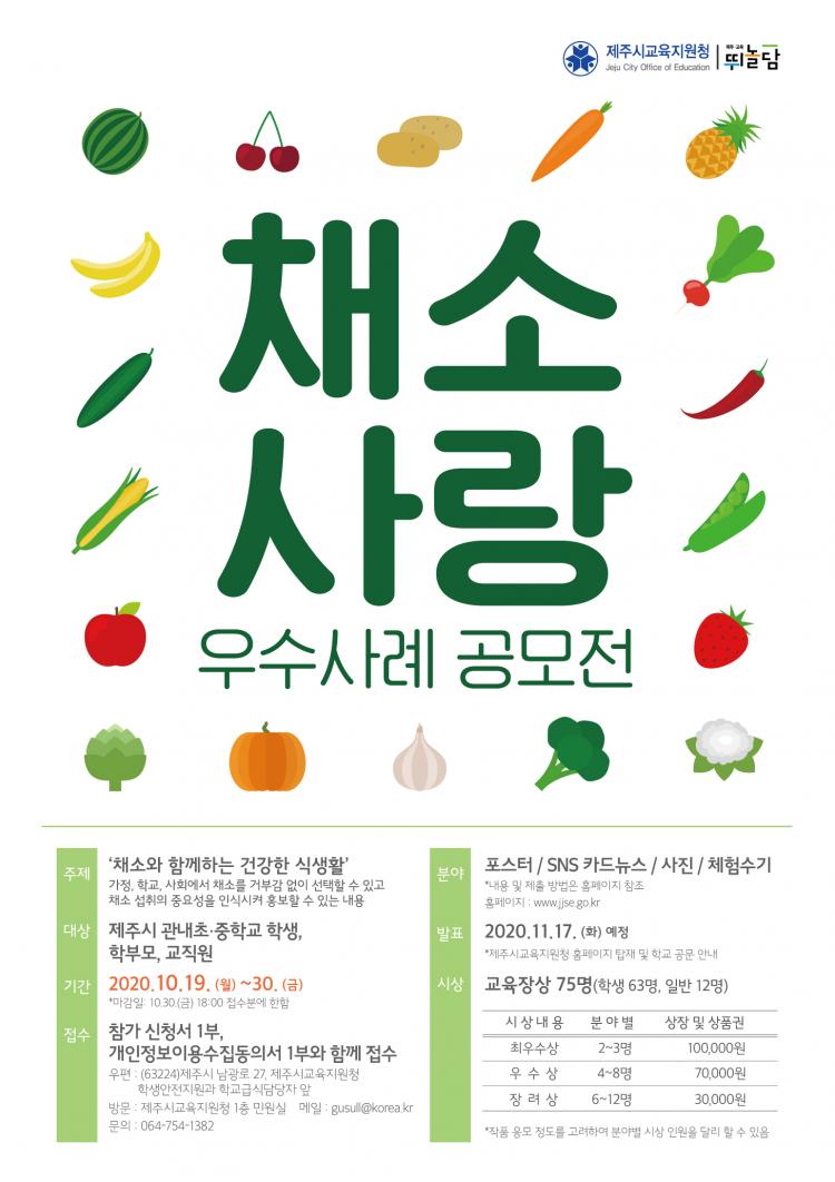 [Á¦ÁÖµµ¹Î½Å¹® = ¿ÀÁØÇõ ±âÀÚ] Á¦Áֽñ³À°Áö¿øÃ»(±³À°Àå À±Å°Ç)Àº ¿À´Â 10¿ù 19ÀÏ(¿ù)ºÎÅÍ 10¿ù 30ÀÏ(±Ý)±îÁö Á¦Áֽà °ü³» ÃÊ¡¤ÁßÇб³ Çлý, Çкθð, ±³Á÷¿øÀ» ´ë»óÀ¸·Î¡®Ã¤¼Ò»ç¶û ¿ì¼ö»ç·Ê °ø¸ðÀü¡¯À» °³ÃÖÇÑ´Ù°í ¹àÇû´Ù. ¡®Ã¤¼Ò»ç¶û ¿ì¼ö»ç·Ê °ø¸ðÀü¡¯Àº ÃÖ±Ù ÇлýµéÀÇ ÆÐ½ºÆ®Çªµå ¹× ź»êÀ½·á ¼·ÃëÀ²Àº Áõ°¡ÇÏÁö¸¸ ä¼Ò ¼·ÃëÀ²Àº ¿ÀÈ÷·Á °¨¼ÒÇÏ´Â µî ºÒ·®ÇÑ ½Ä»ýȰ ½À°üÀÌ Çü¼ºµÇ°í ÀÖ¾î, Çлý, Çкθð, ±³Á÷¿øÀÇ Ã¤¼Ò ¼·Ãë Çʿ伺¿¡ ´ëÇÑ È«º¸¿Í °ü½ÉÀ» À¯µµÇÏ¿© °Ç°­ÇÑ ½Ä»ýȰÀ» ½ÇõÇÏ´Â °è±â¸¦ ¸¶·ÃÇϰíÀÚ Á¦Áֽñ³À°Áö¿øÃ»¿¡¼­ ÃßÁøÇϰí ÀÖ´Ù. À̹ø °ø¸ðÀüÀº ¡®Ã¤¼Ò¿Í ÇÔ²²ÇÏ´Â °Ç°­ÇÑ ½Ä»ýȰ¡¯À̶ó´Â ÁÖÁ¦·Î 4°³ ºÐ¾ß(Æ÷½ºÅÍ, SNSÄ«µå´º½º, »çÁø, üÇè¼ö±â)¿¡¼­ °ø¸ðÇϰí ÀÖÀ¸¸ç, °ø¸ð½É»ç¸¦ °ÅÃÄ ºÐ¾ßº° ÃÖ¿ì¼ö, ¿ì¼ö, Àå·Á µî ±³À°Àå»ó ¹× »óǰ±ÇÀ» Áö±ÞÇÒ ¿¹Á¤ÀÌ´Ù. Á¦Áֽñ³À°Áö¿øÃ» °ü°èÀڴ¡°°ø¸ðÀü ÀÔ»óÀÛÀ» °¢ Çб³·Î ¾È³»ÇÏ¿© °¡Á¤, Çб³, »çȸ¿¡¼­ ä¼Ò¸¦ °ÅºÎ°¨ ¾øÀÌ ¼±ÅÃÇÒ ¼ö ÀÖ°í, ä¼Ò ¼·ÃëÀÇ Á߿伺À» ÀνĽÃų ¼ö ÀÖ´Â ÀÚ·á·Î Àû±Ø Ȱ¿ëÇÒ ¿¹Á¤ÀÌ´Ù¡±¶ó°í ¹àÇû´Ù.
