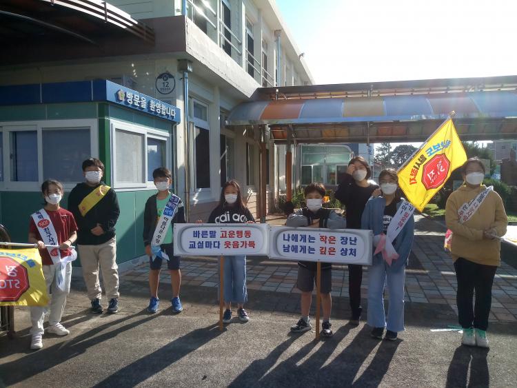 [Á¦ÁÖµµ¹Î½Å¹® = ³²Àç¿Á ±âÀÚ] âõÃʵîÇб³(±³Àå Á¤È£°æ)´Â 2020³â 10¿ù 7ÀÏ(¼ö) ¿ÀÀü 8½Ã 40ºÐºÎÅÍ 9½Ã±îÁö âõÃʵîÇб³ Á¤¹®¿¡¼­ Àü±³»ýÀ» ´ë»óÀ¸·Î ¡®Çб³Æø·Â¸ØÃ硯»ý¸í Á¸Áß Ä·ÆäÀÎÀ» ½Ç½ÃÇÏ¿´´Ù. À̹ø Ä·ÆäÀÎÀº Àü±³¾î¸°ÀÌȸ¸¦ Áß½ÉÀ¸·Î Çѱ۳¯ ±â³äÁÖ°£À» ¸ÂÀÌÇÏ¿© ¾ð¾îÆø·Â ¿¹¹æ Ưº°±³À°À» ¹ÞÀº ³»¿ëÀ» Áß½ÉÀ¸·Î ¾Æ¸§´Ù¿î Áö¿ª »çȸ ¸¸µé±â¿Í Çб³Æø·ÂÃß¹æ ±¸È£¸¦ ¿ÜÄ¡¸ç Æø·Â ¾ø´Â ¹à°í Áñ°Å¿î Çб³¸¦ ¸¸µé¾î ³ª°¡´Âµ¥ ½º½º·Î ¾ÕÀå¼³ °ÍÀ» ´ÙÁüÇÏ¿´´Ù. ¾Æ¿ï·¯ âõÃÊ¿¡¼­´Â Çлý »ý¸íÁ¸Áß ¡®°æ°è ´Ü°è¡¯ ¹ß·É¿¡ µû¸¥ Çб³Æø·Â¿¹¹æ ¹× °¡Á¤°ú ¿¬°èÇÑ »ó´ãÁÖ°£À¸·Î Á¤ÇÏ¿© ÇлýµéÀÌ µû¶æÇÑ ¸» ÇѸ¶µð¸¦ ÅëÇØ ¼­·Î ¹è·ÁÇÏ´Â ¸¶À½À» Ű¿ìÀÚ ´ÙÁüÇÏ¿´´Ù.