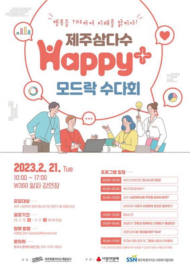 Á¦ÁÖÆ¯º°ÀÚÄ¡µµ°³¹ß°ø»ç°¡ ÁÖÃÖÇϰí, Á¦ÁÖ»çȸº¹Áö°øµ¿¸ð±Ýȸ¿Í Á¦ÁÖ»çȸº¹ÁöÇùÀÇȸ°¡ ÁÖ°üÇÏ´Â À̹ø ¼÷ÀÇÅä·Ð ¿öÅ©¼óÀº¡¸Á¦4ȸ Á¦ÁÖ»ï´Ù¼ö Happy+ °ø¸ð»ç¾÷¡¹ÀÇ ÀÏȯÀ¸·Î ÁøÇàµÇ¸ç ÇöÀçÀÇ º¹Áö¼ºñ½º¿Í Æ®·£µå¸¦ ÆÄ¾ÇÇÏ¿© Á¦ÁÖ ¸ÂÃãÇü º¹Áö»ç¾÷ Áö¿ø¹æ¾ÈÀ» ¸ð»öÇϰí, »ç¾÷À» °íµµÈÇÏ´Â °úÁ¤À» ÅëÇØ º¹Áö¼ºñ½º ¹× Áö¿ø¸ðµ¨À» ¹ß±¼ÇϰíÀÚ ÁøÇàµÈ´Ù.