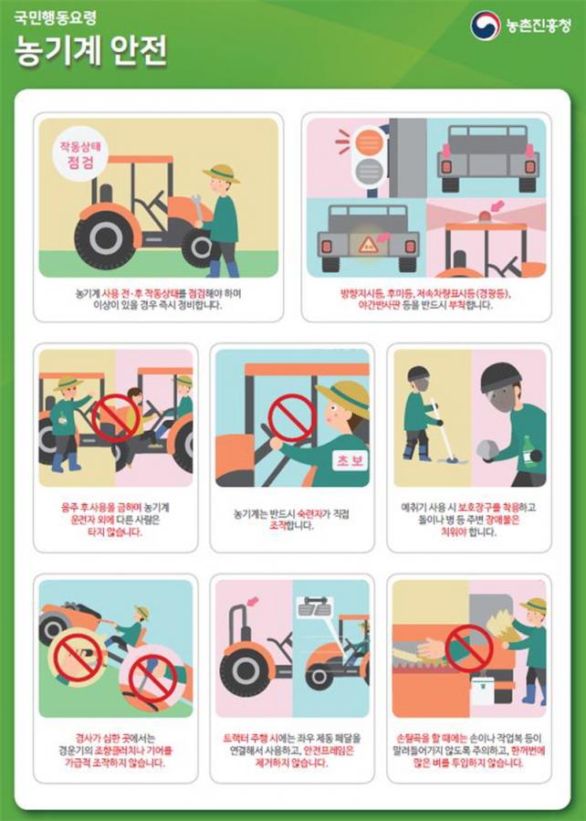 ³ó±â°è ½Â¡¤ÇÏÂ÷ ½Ã¿¡´Â ¾ÈÀü ¼ÕÀâÀ̸¦ Àâ°í ¿À¸£³»¸°´Ù. ³ó±â°è·Î µµ·Î¸¦ ´Ù´Ò ¶§´Â ±³Åë¹ý±Ô¸¦ ÁؼöÇÑ´Ù. ½ÅÈ£°¡ ¾ø´Â ±³Â÷·Î¿¡¼´Â ¼Óµµ¸¦ ³·Ãç ÀϽÃÁ¤ÁöÇϰí ÀüÈÄ¡¤Á¿ìÀÇ ±³Åë»óȲÀ» »ìÆì ¾ÈÀüÇÏ°Ô Åë°úÇÑ´Ù.