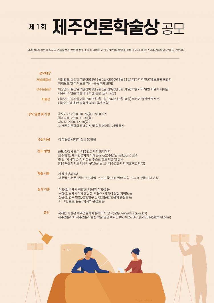 °ø¸ð ºÎ¹®Àº Àú³Î¸®Áò»ó, ¿ì¼ö³í¹®»ó, Àú¼ú»ó µî 3°³ ºÎ¹®ÀÌ´Ù. °ø¸ð ´ë»óÀº ¹ß°£ÀÏ ±âÁØ 2019³â 9¿ù 1ÀϺÎÅÍ 2020³â 8¿ù 31ÀÏ »çÀÌ, Á¦ÁÖÁö¿ª ¾ð·Ð¿¡ º¸µµµÈ ÃëÀ纸µµ ¹× ±âȹº¸µµ(°øµ¿ ÃëÀç Æ÷ÇÔ), ÇмúÁö¿Í ÀÏ¹Ý Àú³Î¿¡ °ÔÀçµÈ Á¦ÁÖÁö¿ª ¾ð·ÐÇÐ ºÐ¾ßÀÇ ³í¹®(°øÀú Æ÷ÇÔ)°ú µ¿ ±â°£¿¡ ÃÊÆÇ ¹ßÇàµÈ Àú¼(°øÀú Æ÷ÇÔ)ÀÌ´Ù. 2°³ ÀÌ»ó ºÎ¹®¿¡ º¹¼ö ÀÀ¸ðµµ °¡´ÉÇÏ´Ù.